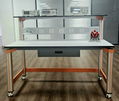 实训桌规格为1600(长)*700(宽)*1300(高),设有一个抽屉;实训桌主体结构全部采用高性能表面氧化的铝型材及一次成型铝压铸框架连接构件,连接构件采用压铸成型工艺(非焊接工艺),经机加工、抛丸、喷砂,表面静电喷涂工艺,安装方便、快捷,用户可自行DIY组装。桌体立柱采用工业铝型材成型工艺,表面氧化处理,截面尺寸:70mm×70mm,四面带槽,槽宽约8mm,端部装有注塑成型配套塑料堵头。桌面采用25mmE1级三聚氰胺饰面板,桌面板下设支撑框架,承受力不少于200kg。配备储存柜,存放元件及工具,储存柜底部4只高强度万向可制动PU脚轮,方便移动。实训装置整体简约不简单,高端大气,符合现代化产品审美和发展趋势。