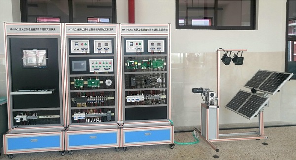 MY-PV22C)由光源模拟跟踪装置、光源模拟跟踪控制系统、能量转换控制存储系统、离网逆变负载系统、监控系统五个部分组成,各功能部分通过通讯电缆和连接电缆进行连接,形成一套能够展示并动手设计、安装、调试的太阳能光伏发电工厂应用的设备。