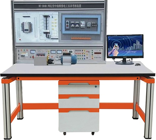 MY-304B 网孔型中级维修电工实训考核装置-是按照劳动和社会保障部颁发的工人等级标准及职业技能鉴定的要求而设计的,该设备由由实训桌、网孔板、实训元器件组成。学生根据实训线路进行元器件的合理布局,安装、接线全部由学生自行完成,接近工业现场,根据不同的配件,能完成电工基础电路,电机控制线路,照明配电的模拟操作,PLC可编程综合应用线路,电子技术应用电路的综合实训,通过一系列项目实训培养学生动手能力和实操技能。