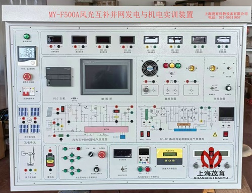 风光互补并网发电与机电实训装置-主要由风力发电机组、太阳能光伏电池组、控制器、蓄电池、逆变器、交流直流负载、开关控制模块、环境监测模块、仪表显示等部分组成,通过PLC控制、触摸屏和变频器作为控制核心,带有A/D、D/A模块、模拟量输入/输出模块、交流电机变频调速系统。系统于风能发电、光伏发电为一体的教学实训系统;各系统通过连接电缆进行连接,形成一套可完成风力及光伏发电、同步并网、离网电源的实验及教学演示。帮助学生理解太阳能并网、离网及风力发电系统的原理,从而起到学习工程实际应用技能的作用。