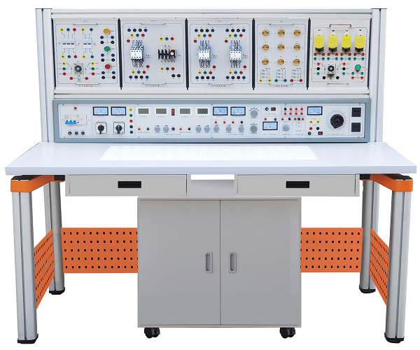 装置由主机箱、实验桌、移动矮柜、电气控制实验挂箱、实验挂箱支架、学生凳等组成。实验桌可组合、可拆装。支架与桌脚一体,铝合金结构;电气控制实验挂箱及各实验模块可根据实验需求自由组合实验。