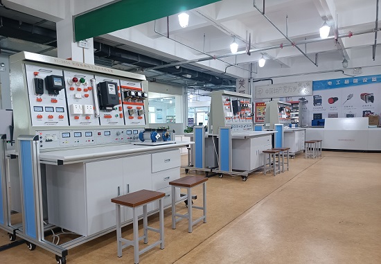 该设备按照标准电气控制柜设计制造(规格:800×460×1850mm),利用双面空间位置,柜内装有完成各种照明电路所需的单相电度表、日光灯、白炽灯、单联开关、感应开关、声控开关、触摸开关、插座等,以及电气控制所需要的多种低压电器,如漏电断路器、熔断器、电流互感器、接触器、中间继电器、时间继电器、热继电器、行程开关、按钮、信号灯、转换开关、电压表、电流表以及三相四线有功电度表等。为了延长电器的使用寿命,降低材料消耗,各电器的接点都已与接线端子相连,学生只需在接线端子上接线训练,以求电气元件经久耐用。技训柜还配备多台附属电机,通过该电动机支持可作各种实验。