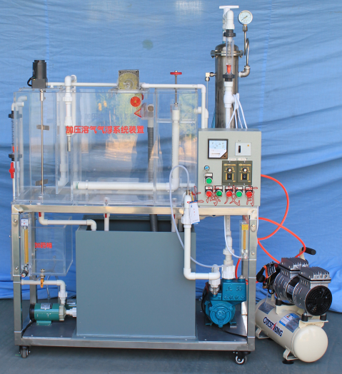 1、平流式气浮池:透明有机玻璃材质、厚度10mm,包含絮凝反应室、气浮反应室、泥水分离室。
