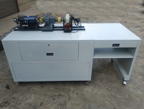 一)实验台采用一体式结构,台架采用2mm和1.5mm冷轧板折弯焊接成形,表面喷塑处理,实验台左边为实训安装调试区块、右边为电脑桌及测试操作区块。左下中部左边设置有一个抽屉、可放置随机工具和资料等,左下中部右边设置有一个下拉式操作台、操作台上布置有10寸液晶显示器:可显示电机功率、圆柱齿轮减速器传动比、蜗轮蜗杆减速器传动比、摆线针轮减速器传动比、称重传感器量程、光栅角位移量程、磁粉制动器量程,适时显示实测数据和变化曲线,右部为电脑桌、电脑和实验台测控系统采用串口通讯、配套测试系统可通过PLC或计算机控制或手动操作实时显示各检测参数及齿轮传动的适时变化曲线,数据可保存、打印及远程传输。