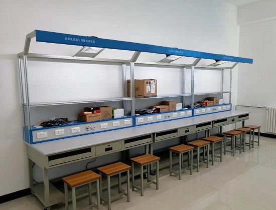 1、实训台:采用工业铝合金型材框架,共两层,其中第一层可放置维修工具、套件、仪器仪表;第二层可放显示器,顶部设有30W日光灯一盏和风扇一台。实训台设有一个抽屉、两个键盘托架、两个主机柜,下方有四个刹车的万向轮。